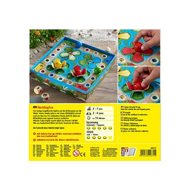 Юу буусан байна? Улаан, шар, ногоон болон цэнхэр үү? Харайгаарай! Мэлхийнүүдээ нар зөв тойрох зүгт шоо буусан өнгөний дагуу нүүлгээрэй. Амттай ялаа! Амттай. Мэлхийгээ нар зөв дараагийн ялаатай нүхэн дээр тавиарай. Чухал: Эзэнтэй нүхийг алгасна! Мэлхийгээрээ эхний тойргоо дуусгасан бол (эхэлсэн цэг дээрээ дахиад ирсэн эсвэл даваад явсан бол), чи нэг усны сараанагийн цэцгийн дэлбээ эргүүлж тавина. Чиний усны сараана чиний эхэлсэн тавцангийн хэсгийн хажууд байгаа. Цэцгийн дэлбээний голд зөөлөн дарж авч эргүүлээрэй. Тоглоомын төгсгөл: Аль нэг тоглогч бүх цэцгийн дэлбэгээ эргүүлж дараагийн тойргоо дуусгасны дараагаар мэлхийгээ цэцгийн голд суулгасан үед тоглоом дуусна. Гайхалтай! Чиний усны сараана ид шидийн мэт өөрөө дэлбээлж байна!